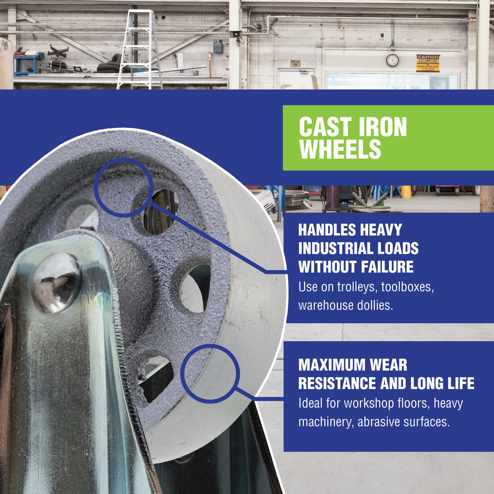 - Durable Cast iron wheel is the longest wearing material for longevity