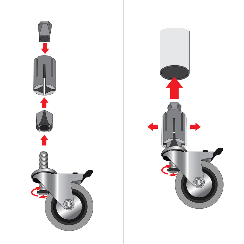 Expanding Adaptors allow Pintle bolt castors to be easily fitted to steel tube frame trolleys.